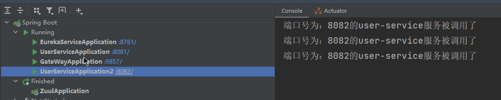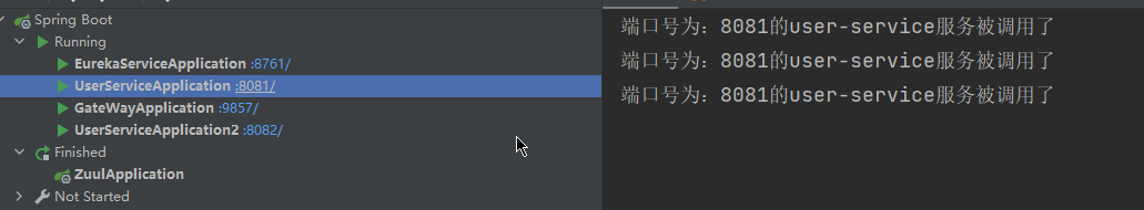可以看到user集群两个都被访问了,达到了网关的负载均衡的功能。