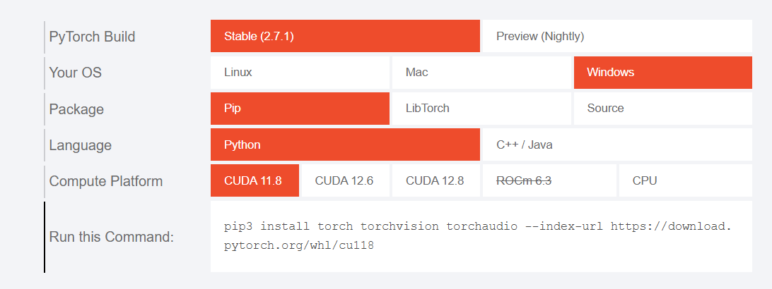 pip install torch torchvision torchaudio --index-url https://download.pytorch.org/whl/cu118