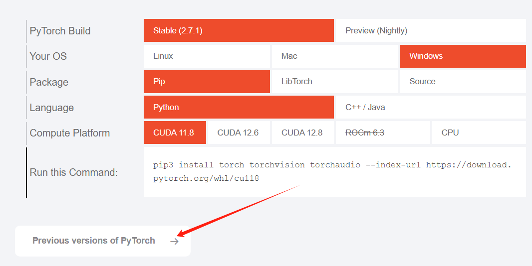 ① 进入torch官网,找到对应版本,复制命令进行安装:
