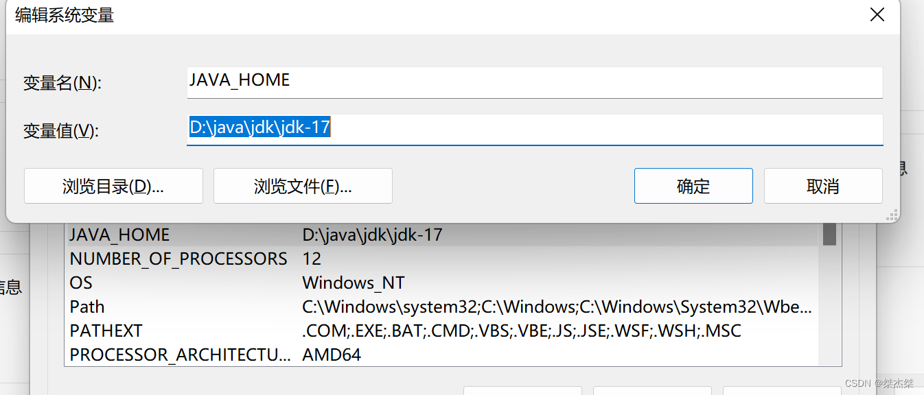 2,在系统环境变量中点击新建 变量名为:JAVA_HOME 变量值:Java17的安装 路径