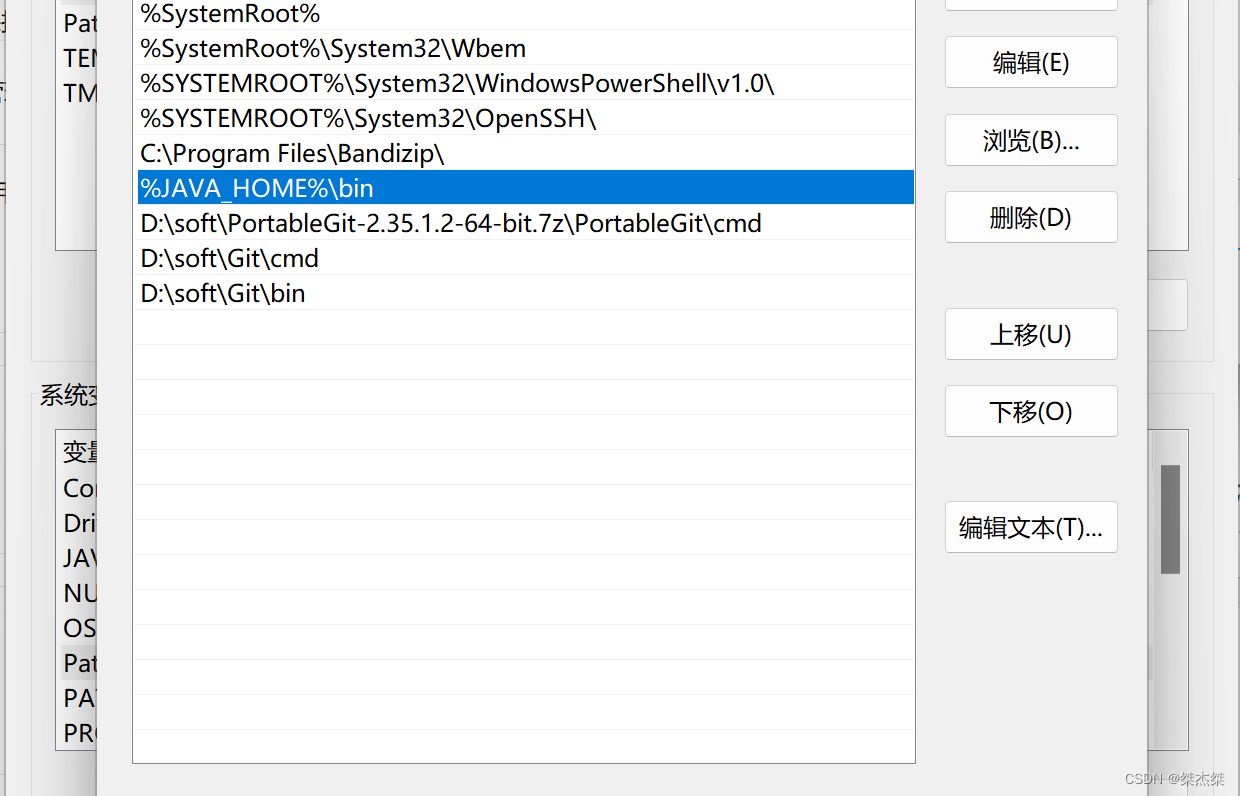 3,在系统环境变量中找到 Path变量 点击编辑 进入编辑后点击新建添加变量: %JAVA_HOME%\bin