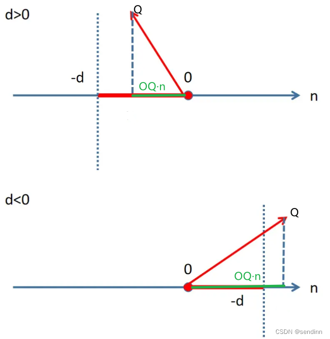 当D是负数,那么平面一定是从原点开始,沿着n向其正方向移动了|d|的长度。