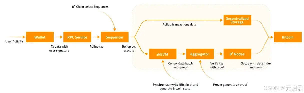 序列器对交易进行排序打包,分别发送到去中心化存储服务进行数据备份,及发送到zkEVM进行执行并生成对应的证明。