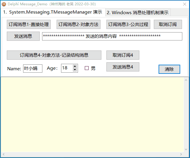 AListener:表示一个消息响应监听处理器,可以是一个内嵌的过程、对象方法、普通过程函数等。演示程序中的订阅消息1对应的是内嵌过程,订阅消息2对应的是对象方法,订阅消息3对应的是普通函数过程,