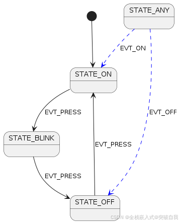 | STATE_ON | EVT_PRESS | STATE_BLINK | entry_blink() |