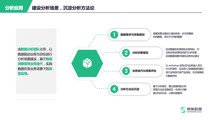 由数据分析团队主导,以数据驱动业务为目标进行分析场景建设,基于数据洞察指导业务迭代,实践数据在各业务场景下的深度应用。