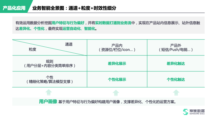 数据产品化应用,可以分为产品内和产品外应用,如下为业务智能全景图:通道+粒度+时效性细分。