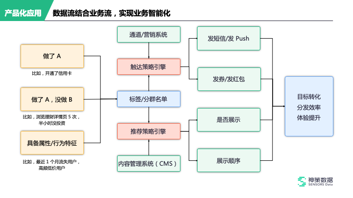 有效运用数据分析挖掘用户特征与行为偏好,并将实时数据打通到业务流中,实现在产品站内信息展示、站外信息触达差异化、个性化,最终实现运营自动化、智能化。结构化来看,数据流结合业务流,可实现业务智能化。