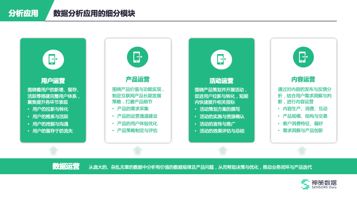 数据驱动精细化运营的细分模块主要可划分为以数据运营为基础,用户运营、产品运营、活动运营、内容运营四大方面,基于企业的性质、阶段、行业可能会存在一些差异。