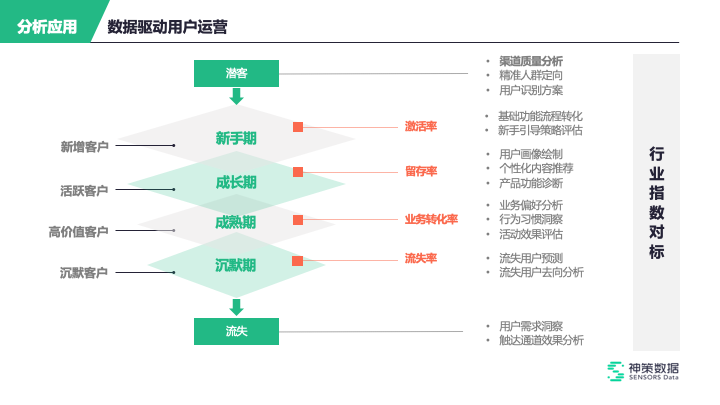 另一方面,在每一个阶段,进行客户的质量评估,这里可以借助一些关键指标去判断,比如新手期的“激活率”,成长期的“留存率”等。同时,每一个阶段都建设更细分的场景去做数据的深度分析。