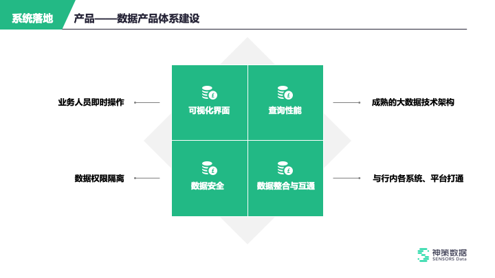 一个成熟的、好用的数据产品体系需要具备哪些能力?一是可视化界面,支持业务人员进行自助式的实时数据分析;二是查询性能,通过成熟的大数据技术架构保障查询的效率;三是数据安全,在私有化部署的基础上还需具备完整的细粒度的数据权限隔离机制,让特定的业务人员只能看、用他所在业务线上的数据,防止数据泄露的风险;四是数据整合与互通能力,使各系统、各平台打通。