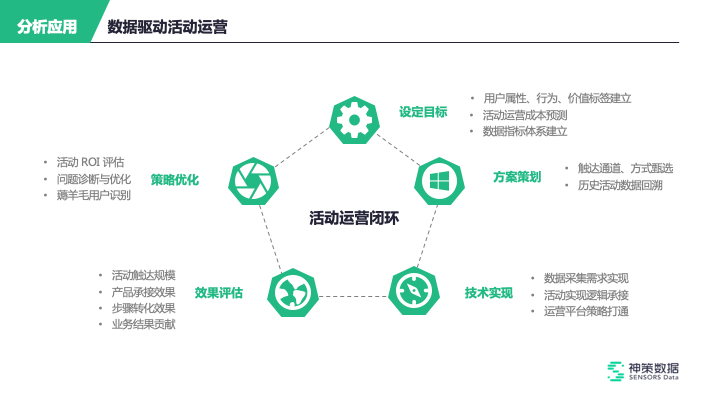 在活动运营的闭环里面,会经历以下阶段,分别是:设定目标——方案策划——技术实现——效果评估——策略优化,每个阶段都可以应用数字化运营。