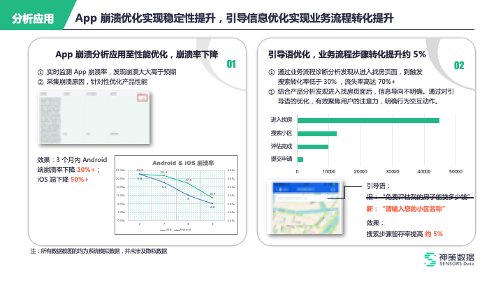 以某金融企业为例。其 App 崩溃优化实现稳定性提升,引导信息优化实现业务流程转化提升。