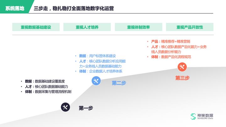 总体来看,如果企业这三点均具备,则具备了数字化运营系统落地的天然条件。如果暂不具备,有一个三步走的侧重建议,如下图。