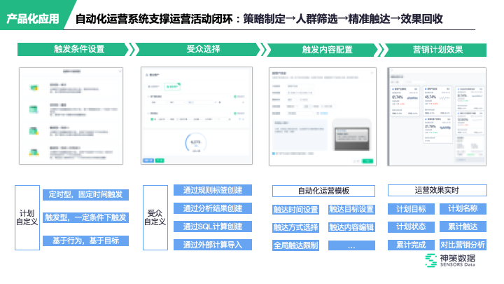 应用数据,即数据产品化,与业务流打通形成实时展示与触达策略。如下图,为数据产品化自动化运营系统的建设思路:策略制定→人群筛选→精准触达→效果回收。