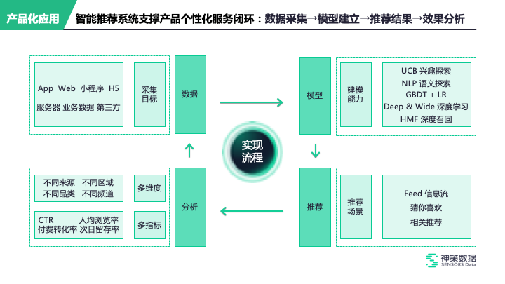另外,智能推荐系统支撑产品个性化服务闭环:数据采集→模型建立→推荐结果→效果分析。