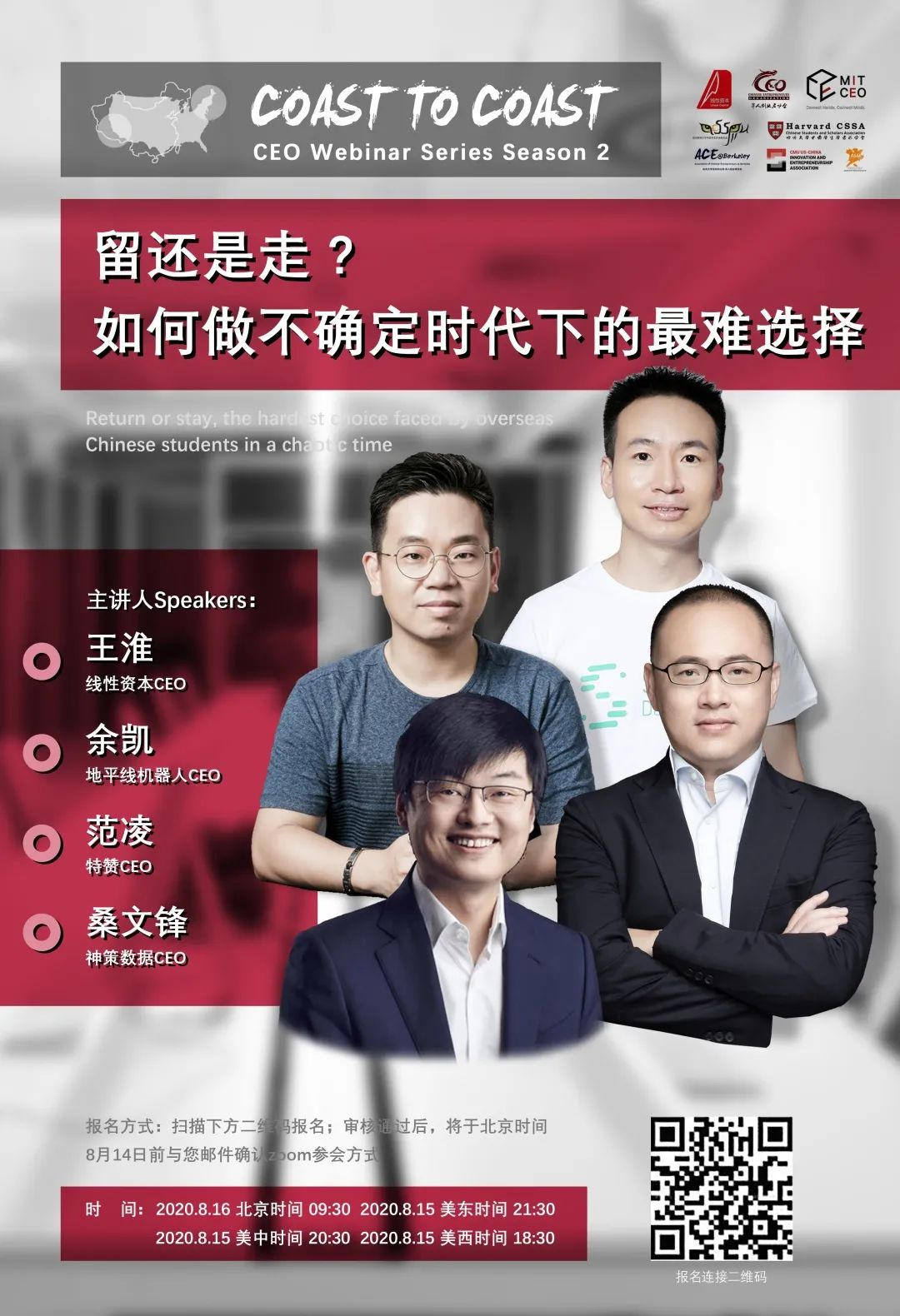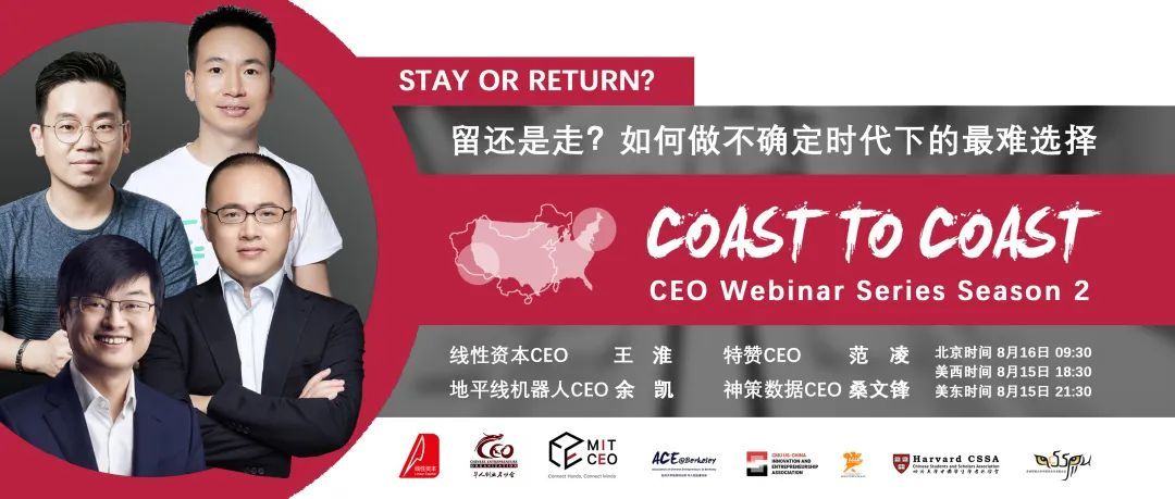 From Coast to Coast: CEO Webinar Series - “中美创投 2020”主题系列讲座是由西海岸的CEO(Chinese Entrepreneurs Organization)和东海岸的MIT CEO (MIT Chinese Entrepreneurs Organization)联合主办,由哈佛大学学联、麻省理工学联、普林斯顿学联、宾大学联、南加大学联等学联,以及伯克利华人创业者协会(ACE)、卡耐基梅隆中美创新创业协会、芝加哥 Build312 和安娜堡 TusStar 等创投组织联合协办的创业投资讲座系列活动。活动旨在邀请中美创投界最杰出、最资深的嘉宾,为对创投感兴趣的小伙伴们分析行业趋势、讲解如何破局。