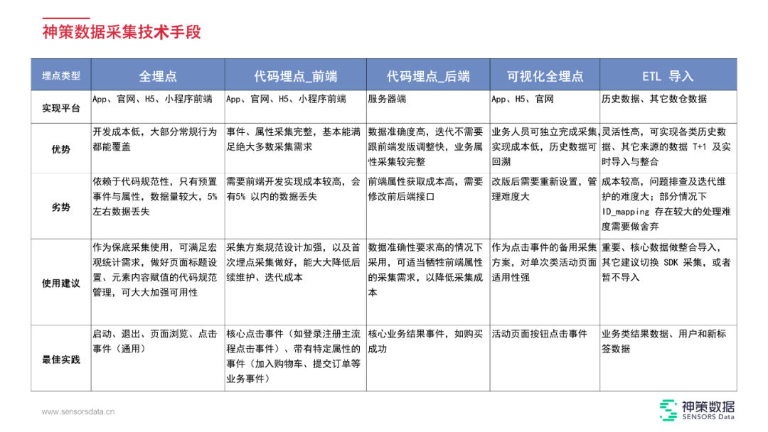 全:多端采集,针对全量用户行为而非抽样,贯穿用户使用产品的整个生命周期