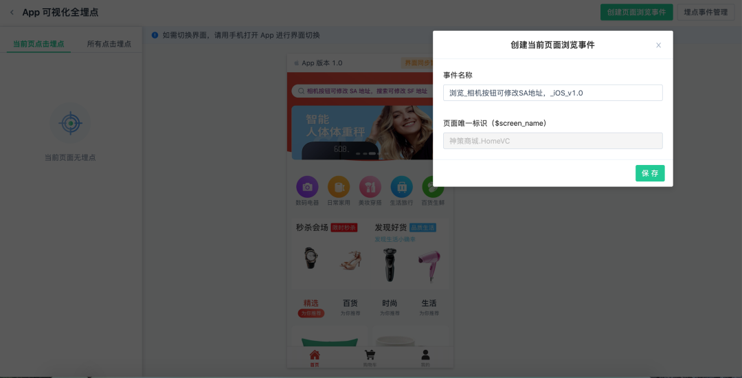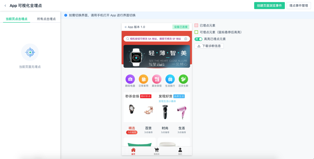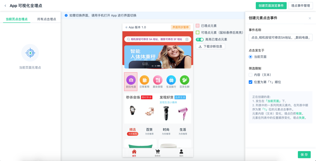 图中是一个已经集成好 SDK 电商 App,可以看到 App 首页有不同的 icon 位和推荐位等相关内容。手机上任意可以点击的位置都会自动命中一个埋点的点位,我们可以自定义一个相关的事件名,比如说首页数码电器 icon 的点击。另外也可以根据条件进行筛选,比如需要的内容文本中,是数码电器需要埋点,还是首页第一个推荐位需要埋点?