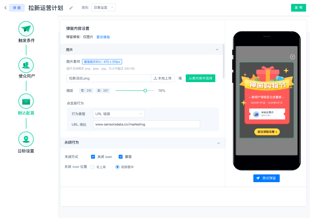 于是,小 A 在粉丝群中编辑并发送了一段活动信息,大意是:“识别二维码,领取新用户百元专属优惠券。”且将设置好的海报推送。接着,小 A 在神策智能运营后台中提供的多种触达方式里,选择“微信小程序弹窗”的方式,而后逐一填选触发条件、受众用户、触达配置、目标设置,神策智能运营 2.0 支持图片、按钮、文字、定向跳转等多种弹窗呈现形式。