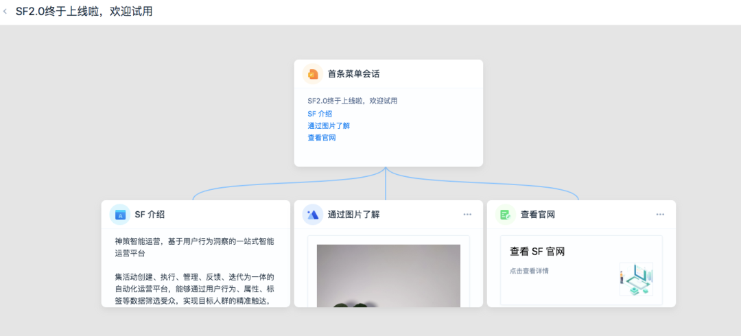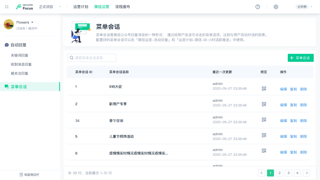 众所周知,微信服务号每月只有 4 次触达用户的机会,如果推送的内容与用户的期望相差太大,用户甚至会直接取关,平台需要根据具体的业务情况,对这 4 次机会进行规划。通过神策智能运营 2.0,运营人员可设置被关注回复,向新用户推送欢迎语、折扣券、历史消息等,还可通过菜单会话的模式促使用户产生更多的交互行为。