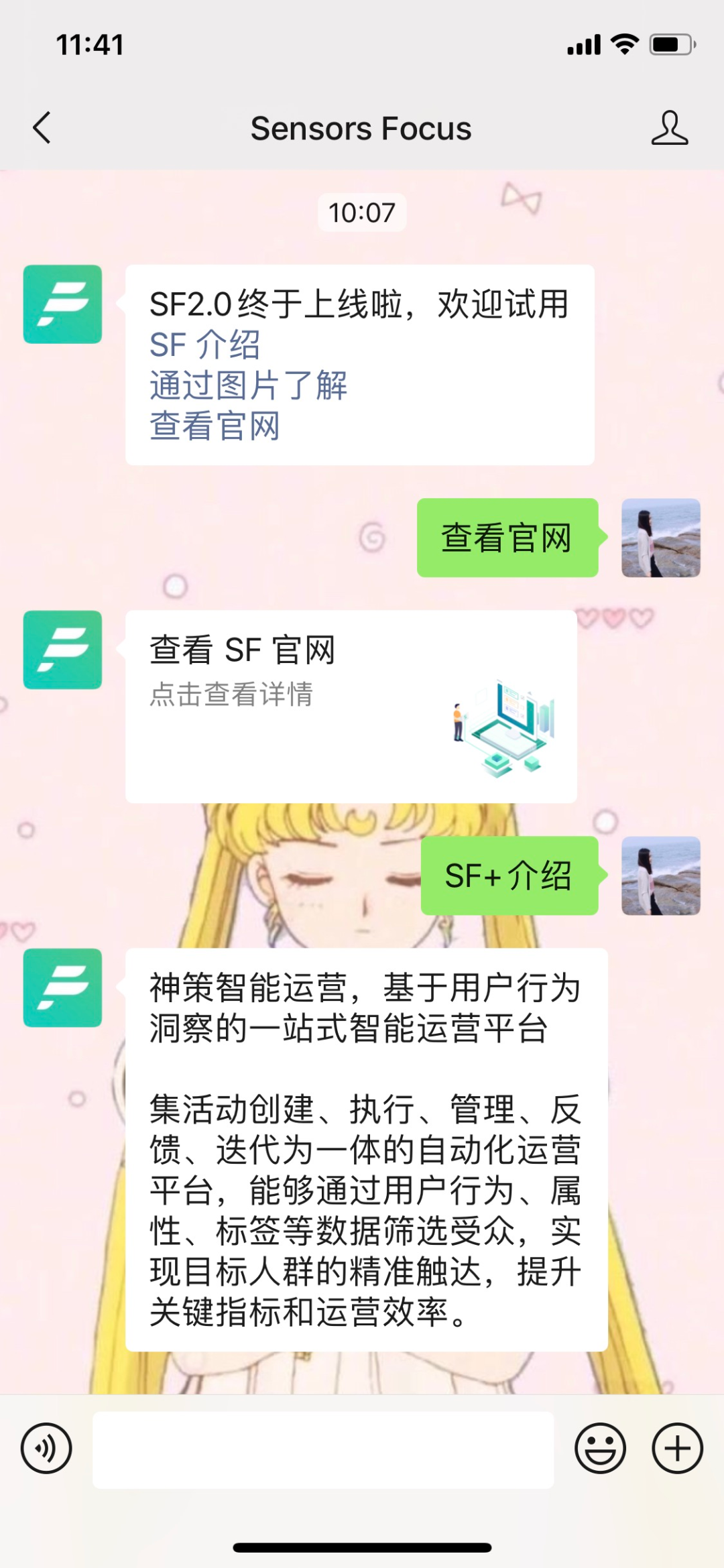 黄金 48 小时是运营人员可以大显身手的好时机,神策智能运营 2.0 支持自动回复、菜单会话、模板消息等多种交互功能,减少运营人员的时间成本,专注核心业务策略。