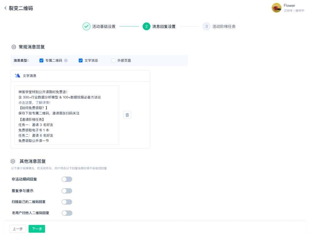 此时,用户乙会被打上一个来自于裂变渠道的用户标签,而用户乙又会根据运营小 B 在公众号设置的被关注回复,收到关于点击“免费领书”菜单按钮即可领取“职场达人秘籍”的活动信息,鼓励用户乙再次分享自己的二维码海报进行好友助力。