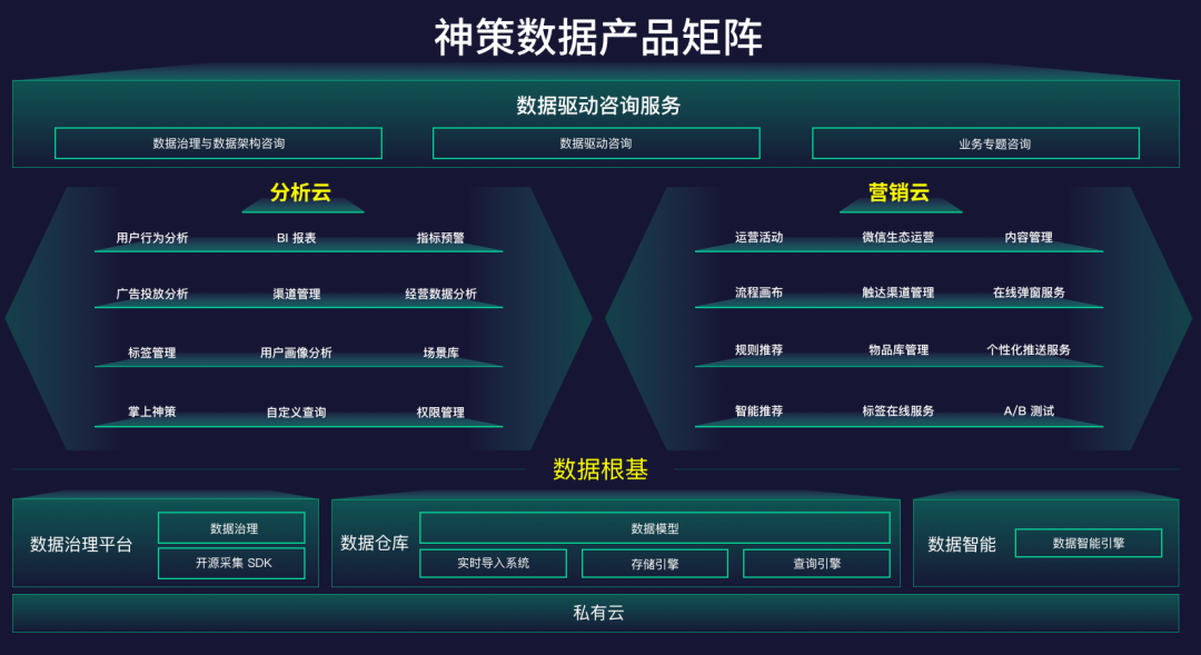 伴随着行业对于大数据应用范围的延伸,如今,神策数据不止提供用户行为数据分析工具,而是整合多种数据源,提供从数据分析到业务行动的全新数字化营销闭环解决方案。并按照全新的 SDAF 运营框架,将神策分析、神策用户画像、神策智能运营、神策智能推荐、神策客景等产品,从一个个单独的产品重新整合成数据根基、分析云、营销云三大部分,旨在坚固的数据根基之上,从神策分析云中得到用户洞察,结合神策营销云形成高效的运营策略。