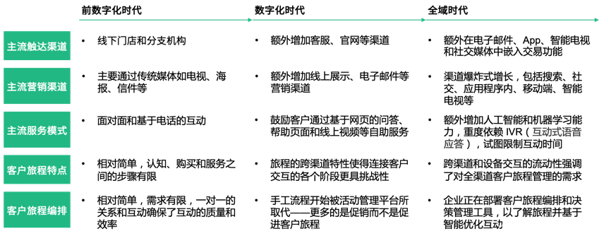 进入 2.0 数字化时代,交易型业务开始向线上迁移,企业通过 banner、电子邮件、在线客服等渠道与消费者互动,客户旅程的跨渠道特性使得连接客户交互的各个阶段更具有挑战性。在这个阶段,手工流程开始被活动管理平台所取代,但这更多地用于促销活动,而非促进客户旅程体验。