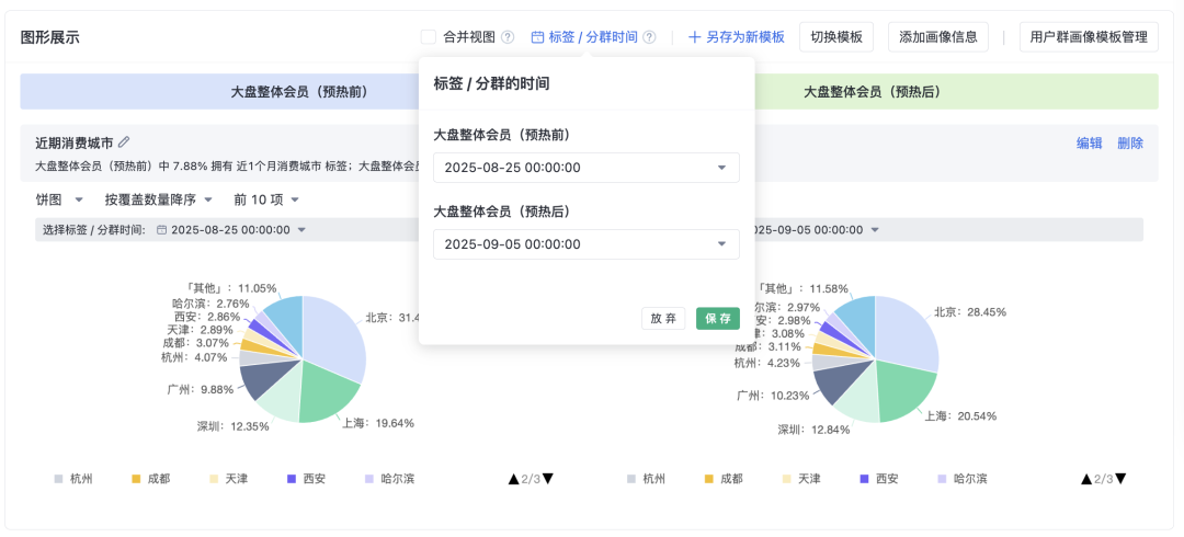 添加画像后,点击「标签/分群时间」,依次选择目标人群、对比人群的画像计算时间。例如分别配置画像的计算时间为预热前、预热后两个时间节点,查看不同区域市场的销售占比变化,发现预热后北京地区占比出现下滑,据此可以指导总部对未达预期的区域加强督导力度或优化地区推广策略。