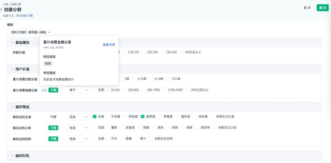 2、 创建分群:选择特征创建方式,切换对应的特征模板,基于人群规则勾选特征条件。例如在「偏好商品」特征组中勾选“购买过的主食”为“菠萝堡”,即可得到菠萝堡人群。
