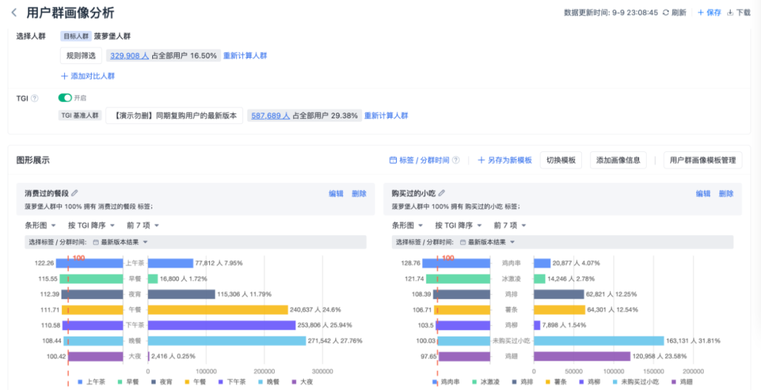 3、对比不同人群的特征差异:在用户群画像分析模型中,依次配置目标人群、TGI基准人群,选择现有画像模板或添加画像信息,查看人群的特征分布差异。例如分别配置目标人群为菠萝堡人群、TGI基准人群为同期复购人群,查看用户在餐段、小吃上的消费差异,发现菠萝堡人群更偏好上午茶时段(TGI :122.26)、更偏好鸡肉串(TGI:128.76),据此可以指导菠萝堡提频策略中套餐组合及沟通时机的制定。