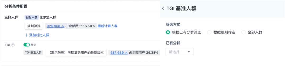 支持对同一人群在不同时间段的多维画像进行差异对比,并可灵活配置 TGI 基准人群。企业可以更精准地识别人群的独特偏好和趋势变化,避免被绝对数值误导,让洞察更具深度和参考价值。