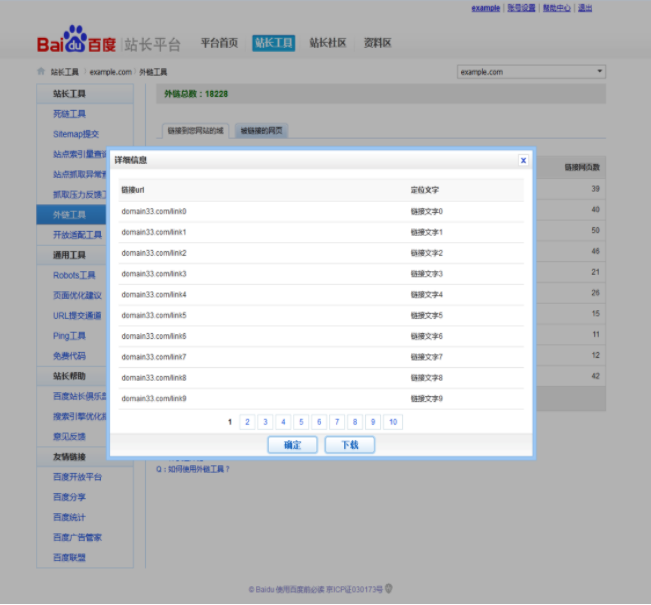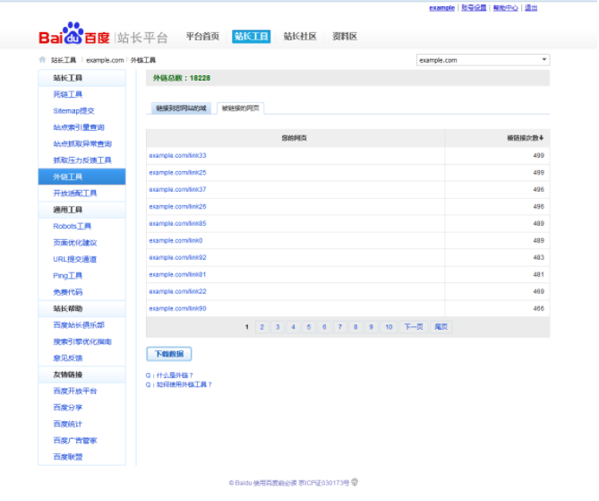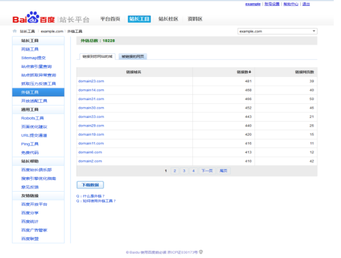 站点经过验证之后,点击“站长工具”—“外链工具”,到达外链工具页面之后,在页面右上角选择需要查询的站点之后,就可查看链接到自己网站的域,每个域的链接数量、链接的网页数的统计,并支持数据的下载。外链工具beta版本目前可显示链接最多的主域top40统计。