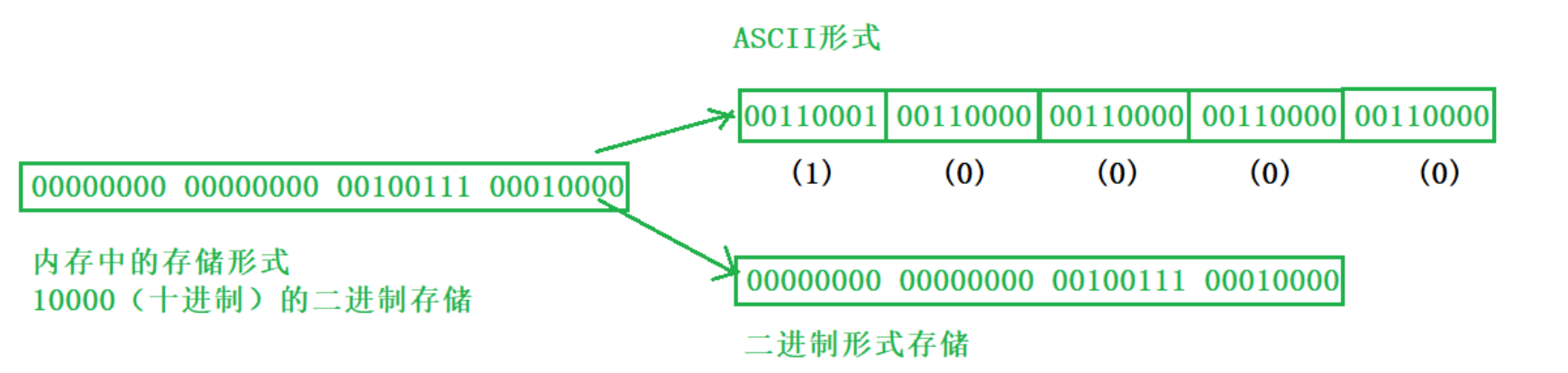 对于一个整数10000(十进制),以ASCII码形式输出时需要5个字符('1', '0', '0', '0', '0'),而以二进制形式输出时只需要4个字节来存储这个整数的二进制表示。
