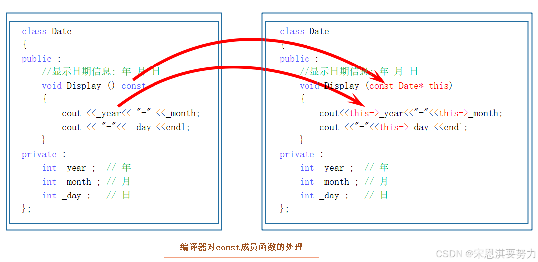 但不是所有成员函数都可加这个const,要修改的对象成员变量函数不能加,只要成员函数内部不修改成员变量都应该加const。这样普通和const对象都能调用。