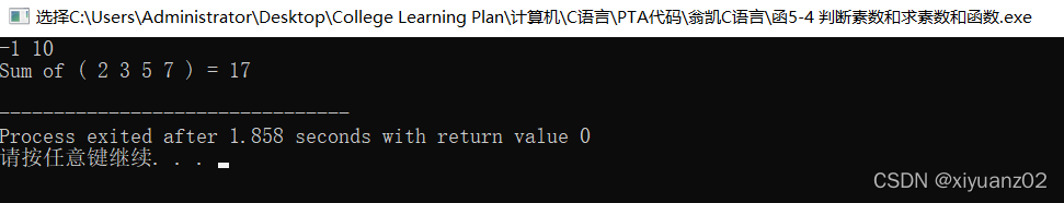 本文介绍了如何实现一个判断素数的函数以及计算给定区间内素数和的函数。提供了一个C语言的代码示例,包括prime函数用于判断素数,PrimeSum函数用于计算素数和,并展示了在特定输入样例下的运行结果。