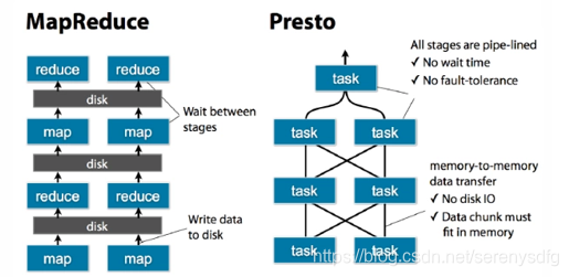 Presto是常驻任务,接受请求立即执行,全内存并行计算;hive需要用yarn做资源调度,接受查询需要先申请资源,启动进程,并且采用mapreduce计算模型,中间结果会经过磁盘。