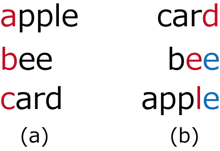 例えば apple, bee, card は、普通の辞書なら apple → bee → card の順になります。