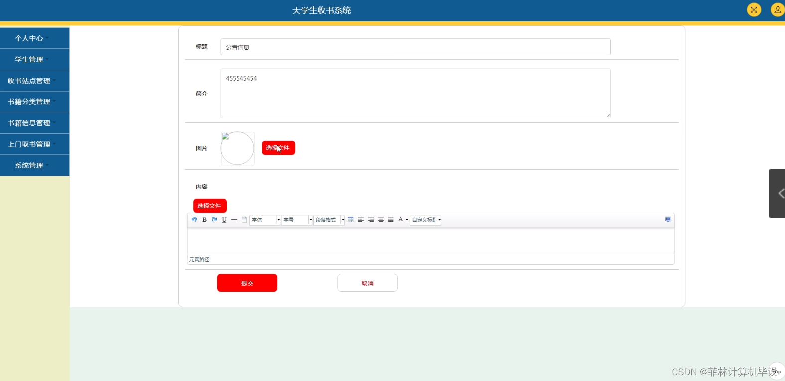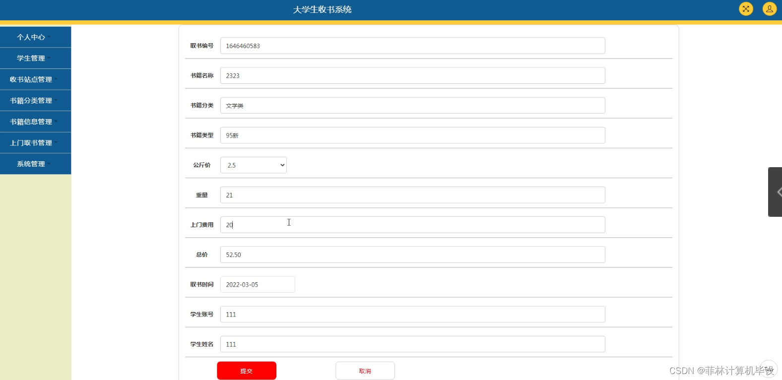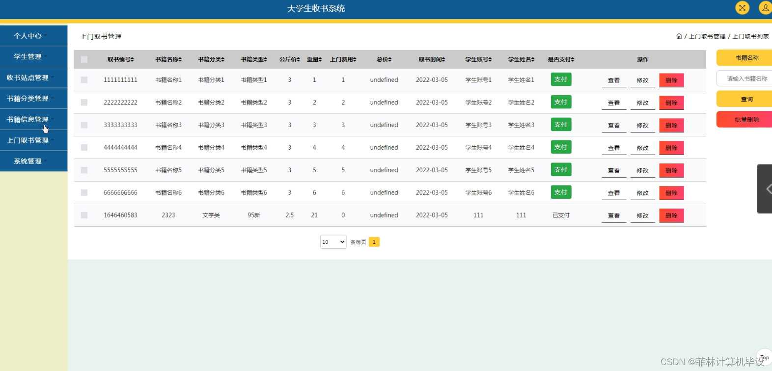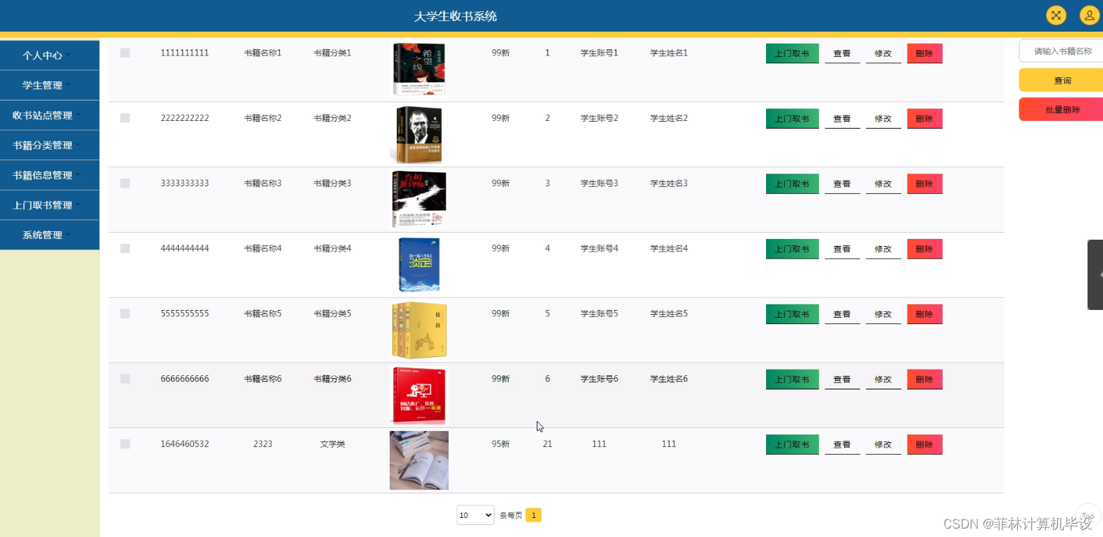 随着大学生活的步入,课本和参考书成为了大学生们的必备品。然而,传统的购买方式存在着很多问题,如价格高昂、选购不便等。因此,开发一款高效、便捷、实用的大学生收书系统成为了大学生们迫切需要解决的问题。系统可以实现图书信息的录入、查询、修改和删除等多项业务操作,同时还可以进行在线选购、订单管理、快递跟踪等多项服务功能。通过引入先进的技术和理念,大学生收书系统可以大大提高大学生的购书效率和体验质量,为同学们提供更好的学习资源和服务