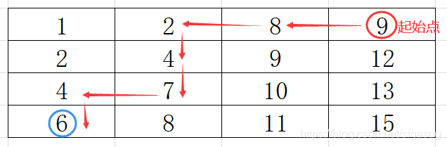 思路3:从左上角开始找,大于则排除整列,左移一个数继续,小于则往下看,重复以上