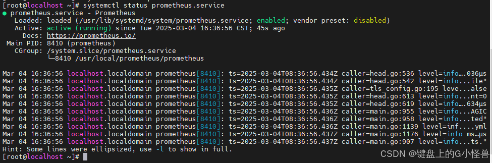 4、启动后,可以使用 systemctl status prometheus.service 命令查看状态,出现下图界面,表示启动成功: