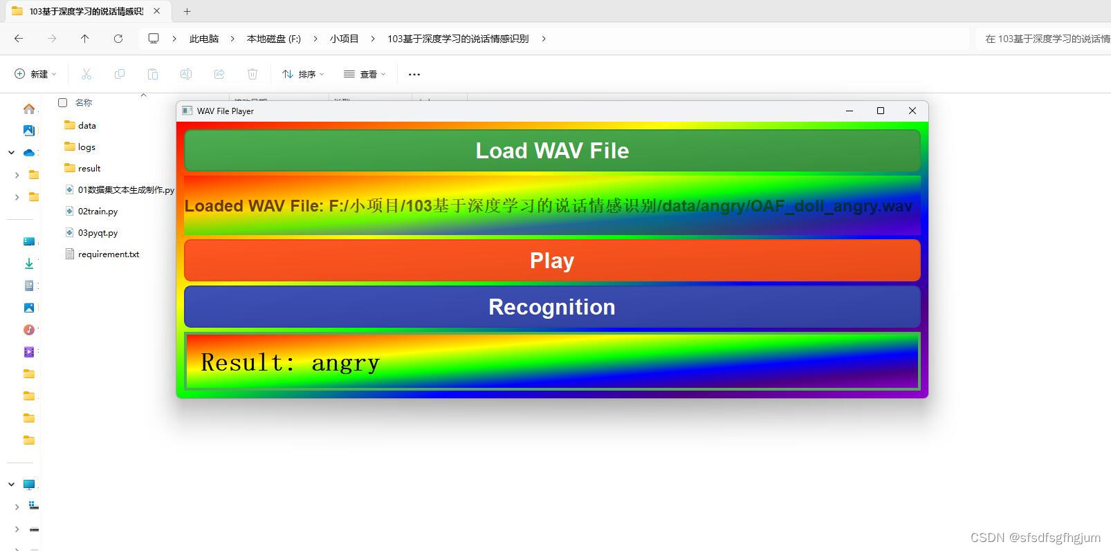 这是运行python 03pyqt.py的可视化界面,通过第一个按钮加载需要检查的说话情感的音频,运行第三个按钮就会将检测结果,比如加载anger(生气)这个声音的音频,就能对检测结果显示在下方Result处。