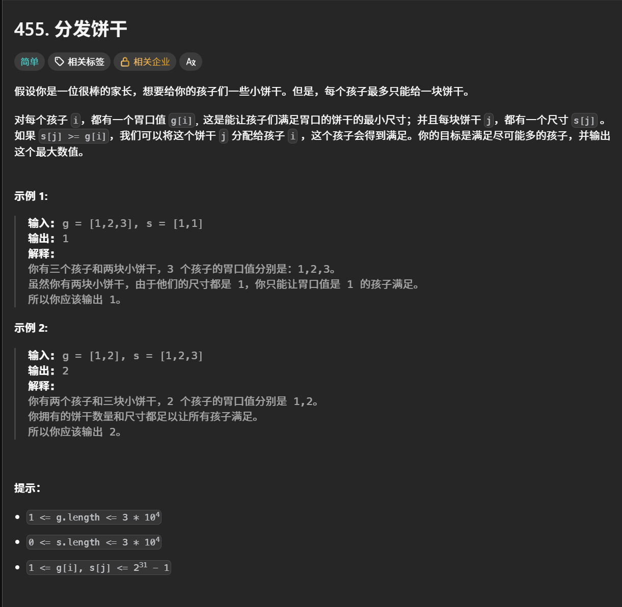 和优势洗牌差不多而且更简单 此题不需要映射 直接双指针 固定孩子 让另一个指针去找饼干 找不到 孩子指针就不++