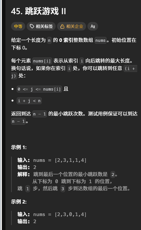 动态规划可以给出一个on2的做法 dp[i]=dp[k]+1 if(k+nums[k]>i)