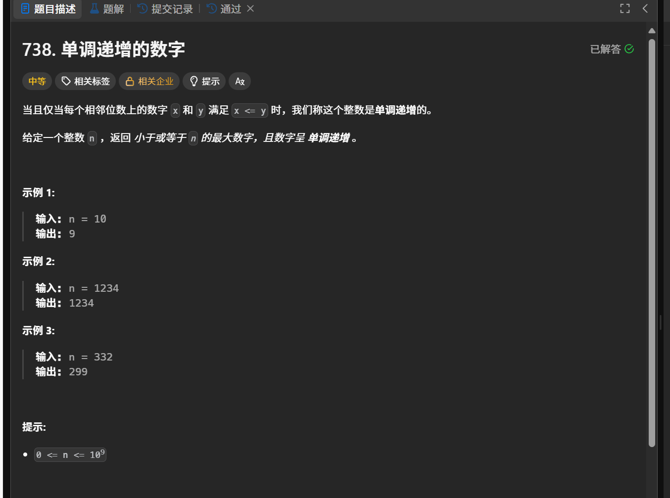 先把数字转化为字符串 然后遍历找到第一个不满足递增的数字 把它前面的一个数字减一 再把后面的数字全部置成9