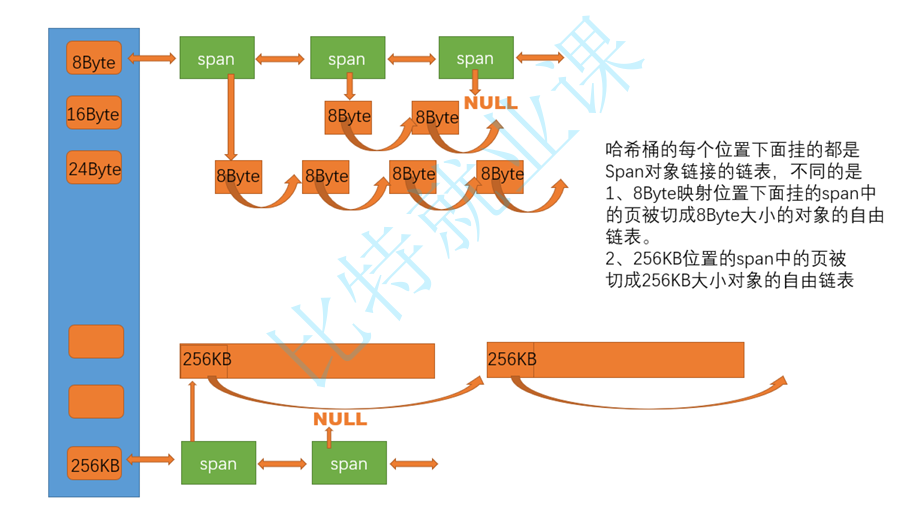 central cache也是一个哈希桶结构,他的哈希桶的映射关系跟thread cache是一样的。不同的是他的每 个哈希桶位置挂是SpanList链表结构,不过每个映射桶下面的span中的大内存块被按映射关系切成了一 个个小内存块对象挂在span的自由链表中。