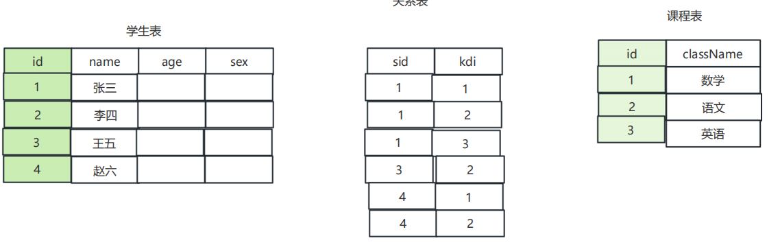 学生可以选多门课程,一门课程也可以被多个学生选,所以这是一个多对多关系,这时我们不能仅仅依靠关联字段联系两个表,要单独创建一个关系表来让两个表联系起来。