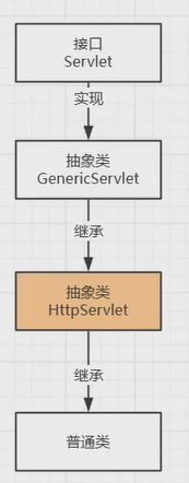如图,这是Servlet执行流程,我们要先让普通类继承HttpServlet这个抽象类,其实,HttpServlet还继承了GenericServlet这个抽象类,而GenericServlet又实现了Servlet接口。