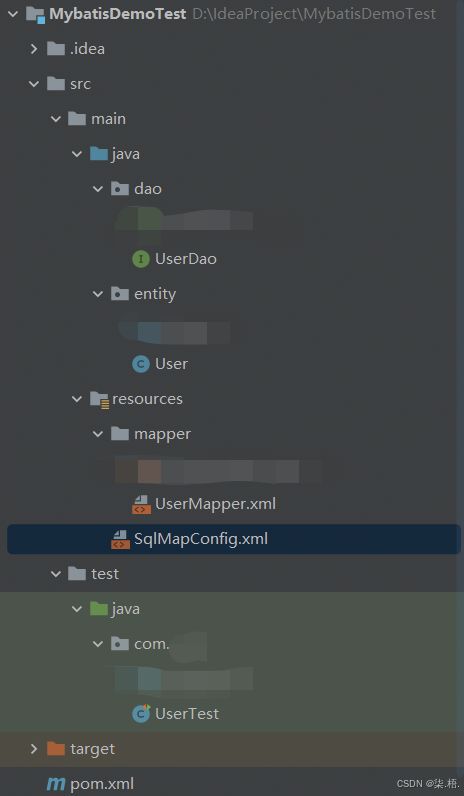 测试类(UserTest.java):基于JUnit框架实现单元测试,封装了MyBatis的初始化(加载配置、创建SqlSession)与资源释放逻辑,为每个数据操作方法提供独立的测试入口。